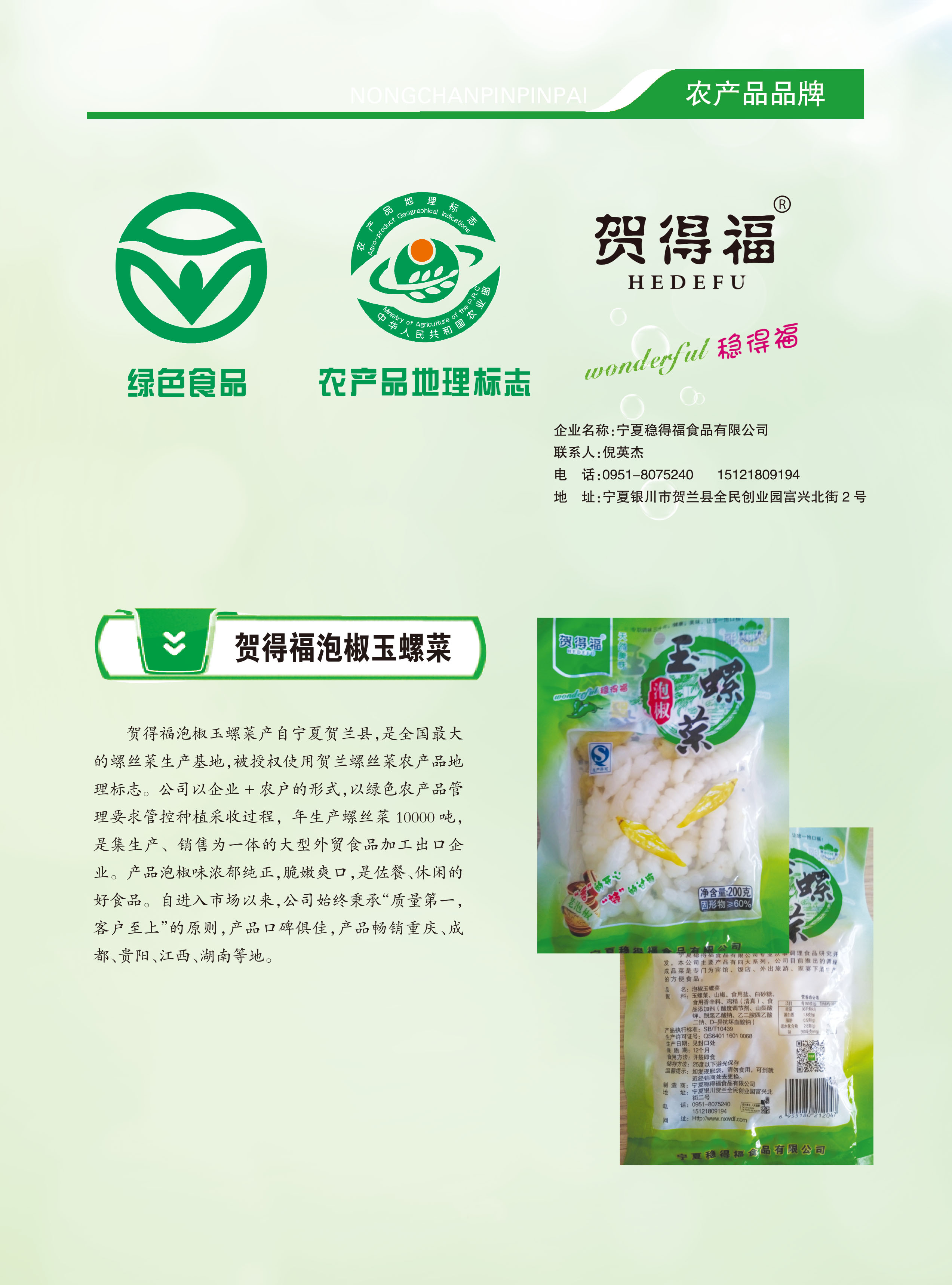 首届宁夏优质特色农产品品牌—贺得福泡椒玉螺菜