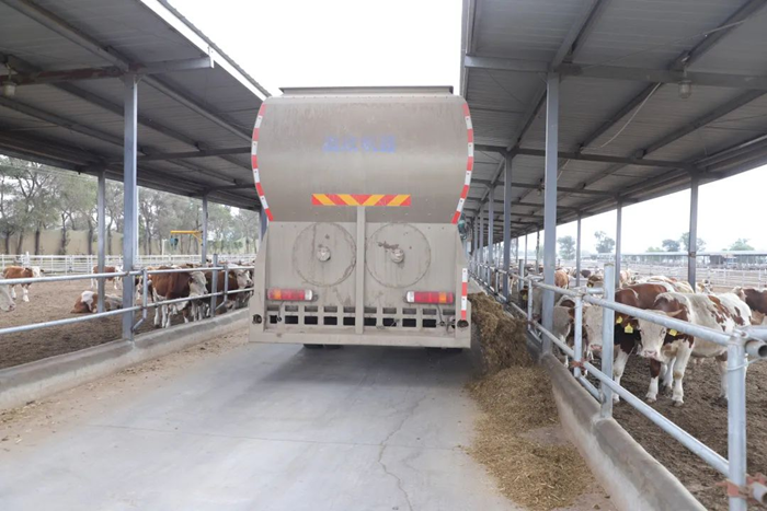 随着装载配制好饲料的饲喂车缓缓开进牛棚,牛群纷纷凑近食槽,发出“哞哞哞……”的叫声,它们早已习惯这样的饲喂方式。