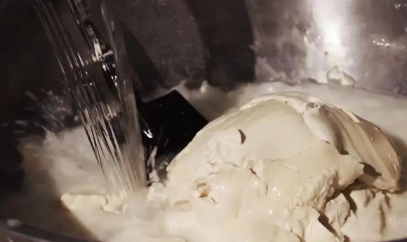 搅时先把粉浆慢慢放入开水中,一边入浆一边搅,防止粉浆沉底造成糊锅。一直搅到黏稠适度,立即起锅倒入盆中。待晾冷后,凉粉坨子就算成功了。