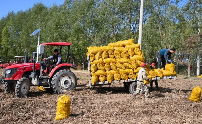 大家麻利地将马铃薯去泥、分拣、装车,对已经收获的土地进行废膜清理回收。大家分工协作,工作紧张有序地开展,呈现出一片繁忙的景象,透露出浓厚的丰收气息。