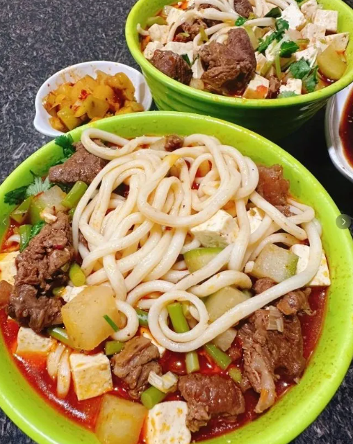辣糊糊是银川独有的特色小吃,捣成的辣椒面混合芝麻、花生核桃碎调和,让辣香、甜香再增一重坚果油香。最后以鸡汤吊鲜,搅合成酱汁般浓稠的汤底。待锅开,沸腾唤醒重重香气,软弹筋道的牛筋面身披红浪,红糊中几度翻滚,香鲜汤汁顺面上的小孔钻入钻出,下锅几秒立入味,一夹出汁。