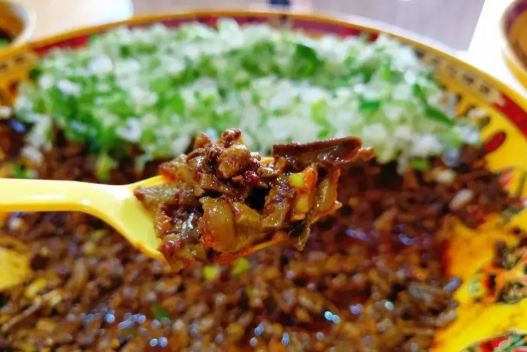 选用盐池滩羊的羊肝制作浇头。煮羊肝的同时,可以另起锅放油炸辣子并捞出红辣椒;等羊肝熟了,切成豌豆大小的块,然后倒进炸好的辣子油里,将羊肝炸到酥香,最后再把捞出的红辣椒重新倒进去跟羊肝一起炸。这样做出来的羊肝不腥不膻也不会腻。