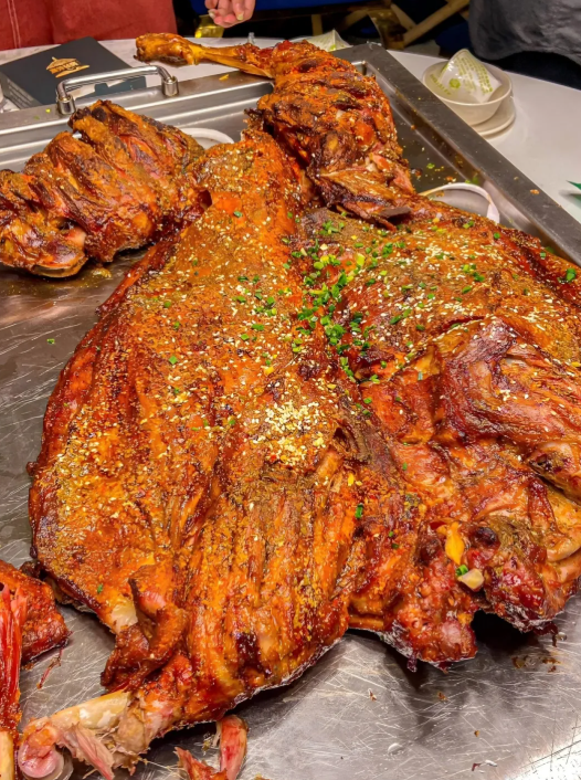 经过三个小时左右的刷油,切割,撒上秘制的配方,再不停的回炉翻烤,全碳火翻滚烤制,热乎乎的烤全羊就这样被抬上了桌,外皮金黄酥脆,内部肉软鲜嫩,羊味芳香扑鼻迎面而来……