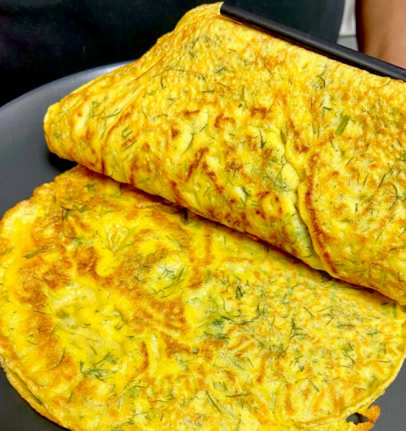 切碎的茴香叶打入蛋液,在热油中摊成金黄色的蛋饼。