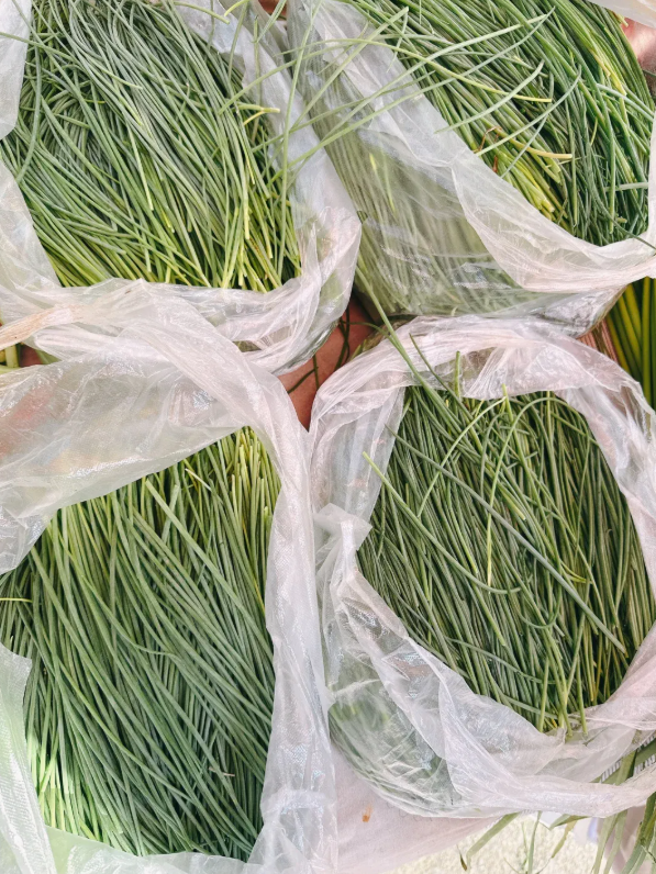 还有新鲜的沙葱,餐厅里的凉拌沙葱、沙葱炒鸡蛋就是以此为食材,本地人还喜欢买新鲜的沙葱回去,包成沙葱鸡蛋馅的饺子,据说很是鲜香。
