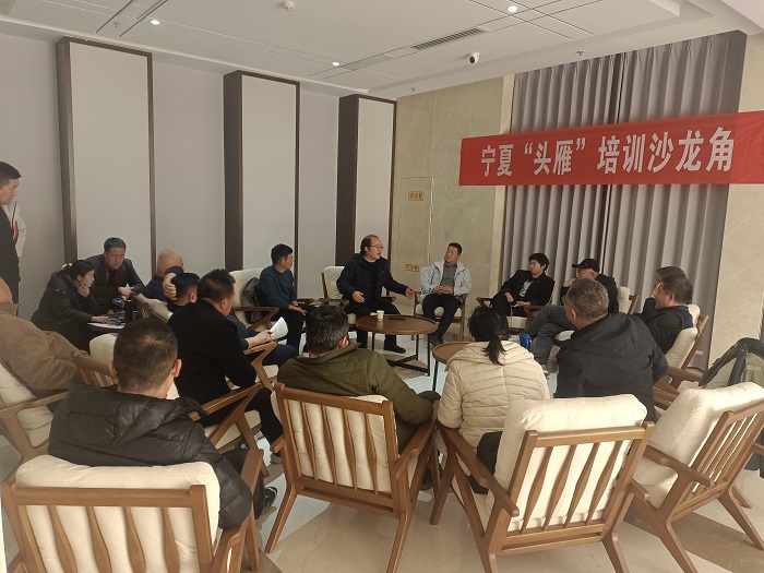 “多元交流”行笔,串起优势互补“金色链条”。培训班设立宁夏“头雁”培训沙龙角,多次举办皖、陕、宁三省(区)“头雁”论坛、“头雁”导师见面会、“头雁”学员交流分享会,汇聚来自各省(区)的“头雁”和专家,通过专家主题分享与学员互动交流的融合模式,深入探索乡村产业和人才振兴的新理念、新策略,旨在有效解决学员在生产实践中面临的各种难题,促进知识与实践的深度融合,搭建共同发展的平台。导师见面会上,各位专家凭借深厚的专业知识,对学员的疑问逐一进行深入剖析,用通俗易懂的语言解释背后的科学原理,有针对性的提出解决方案,引荐相关领域的专家,为“头雁”学员提供持续的答疑和深度帮扶。