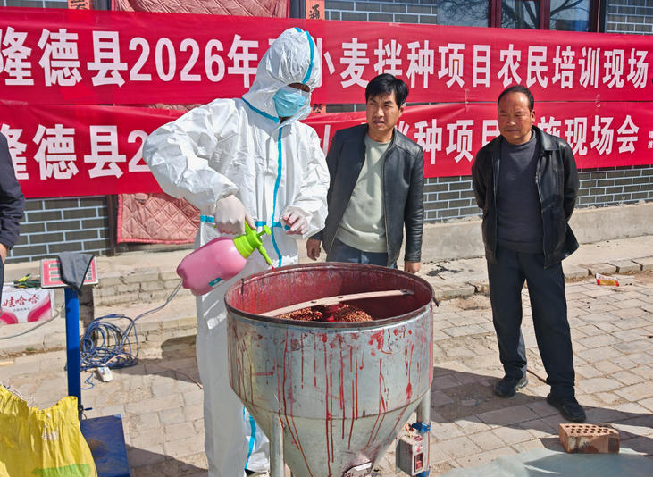 项目采取物化补贴和作业费补助相结合的方式,招标采购对路杀虫、杀菌种子处理悬浮剂,遴选企业统一拌种,实地培训拌种操作规范,实现统一供药、统一拌种、应拌尽拌,坚决杜绝白籽下地。各县区结合生产实际,多措并举、协同发力,有序推进拌种工作落实。平罗县由中标企业发放药剂,印制小麦拌种指导意见,开展现场实操培训后种植主体自行拌种;贺兰县由中标企业提供药剂和拌种设备,农户自行拌种或农户提供种子,中标企业统一拌种两种方式进行;中宁县种植大户及村集体由中标企业提供药剂,统一拌种,小农户由中标企业提供药剂,开展培训后自行拌种。截至3月12日,全区已完成拌种面积41.17万亩,拌种进度68.61%。