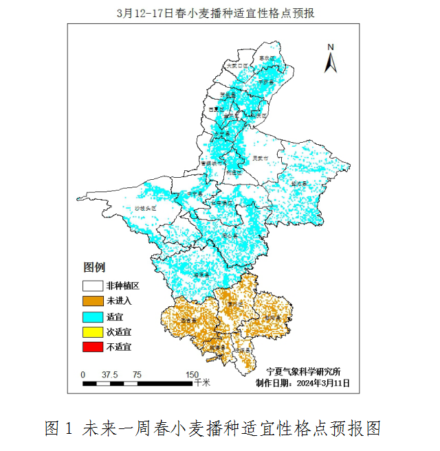 据宁夏气象台预报:预计未来一周我区多大风沙尘天气,气温先升后降,其中,12日白天,吴忠市东南部,固原市有4级左右偏南风,部分地区阵风6~7级;14-20日全区多大风沙尘天气;受新疆冷空气东移南下影响,16-18日全区气温持续下降,18日平均气温较15日下降6℃左右。根据春耕春播农用天气预报等级指标分析,3月12-17日灌区及中部干旱带各地气象条件适宜春小麦播种(图1)。由于周内多大风沙尘天气,不利于田间作业,干扰春耕春播进度。