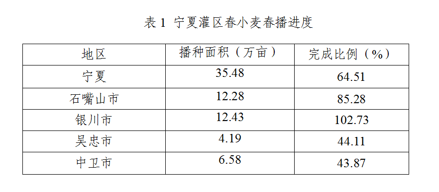 上周灌区各地平均气温1.2~3.6℃,与常年同期相比,惠农偏高0.2℃,中宁持平,其他地区偏低0.1~1.0℃;中部干旱带平均气温0.3~3.1℃,与常年同期相比,同心偏高0.1℃,其他地区偏低0.1~0.9℃。灌区及中部干旱带各地无降水,较常年同期偏少0.5~1.5mm。周内气温偏低,无降水天气过程,有利于春小麦播种,灌区部分地区已完成播种任务,中部干旱带春播工作陆续开始。根据自治区农业农村厅春播进度统计数据,截至3月10日,宁夏灌区春播进度为94.24%。其中,石嘴山市85.28 %,银川市102.73%,吴忠市44.11%,中卫市43.87%(表1)。