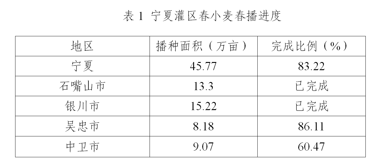 根据自治区农业农村厅春播进度统计数据,截至3月12日,宁夏灌区全面完成春播任务;目前,中南部地区红寺堡区、同心县、海原县正在陆续播种,固原市原州区、西吉县播种还未开始。(详见表1)。