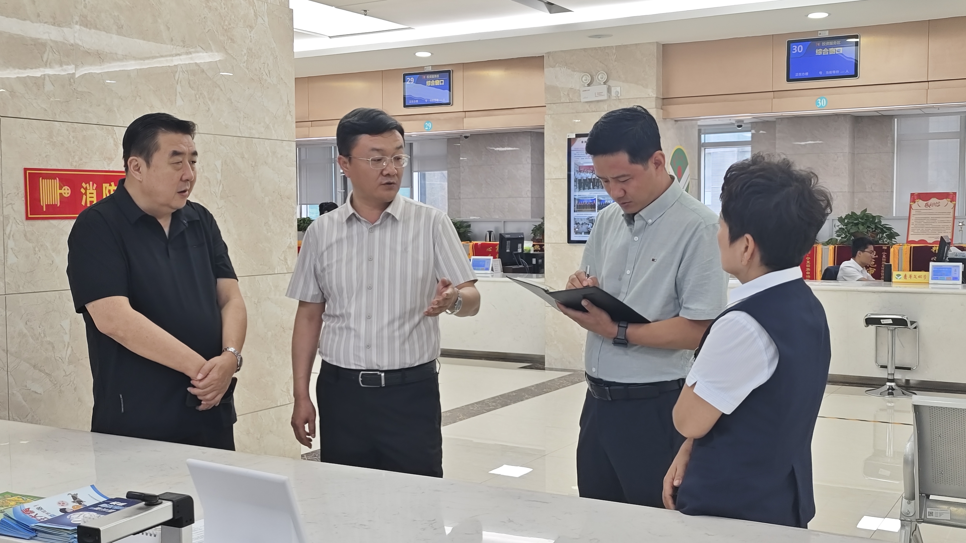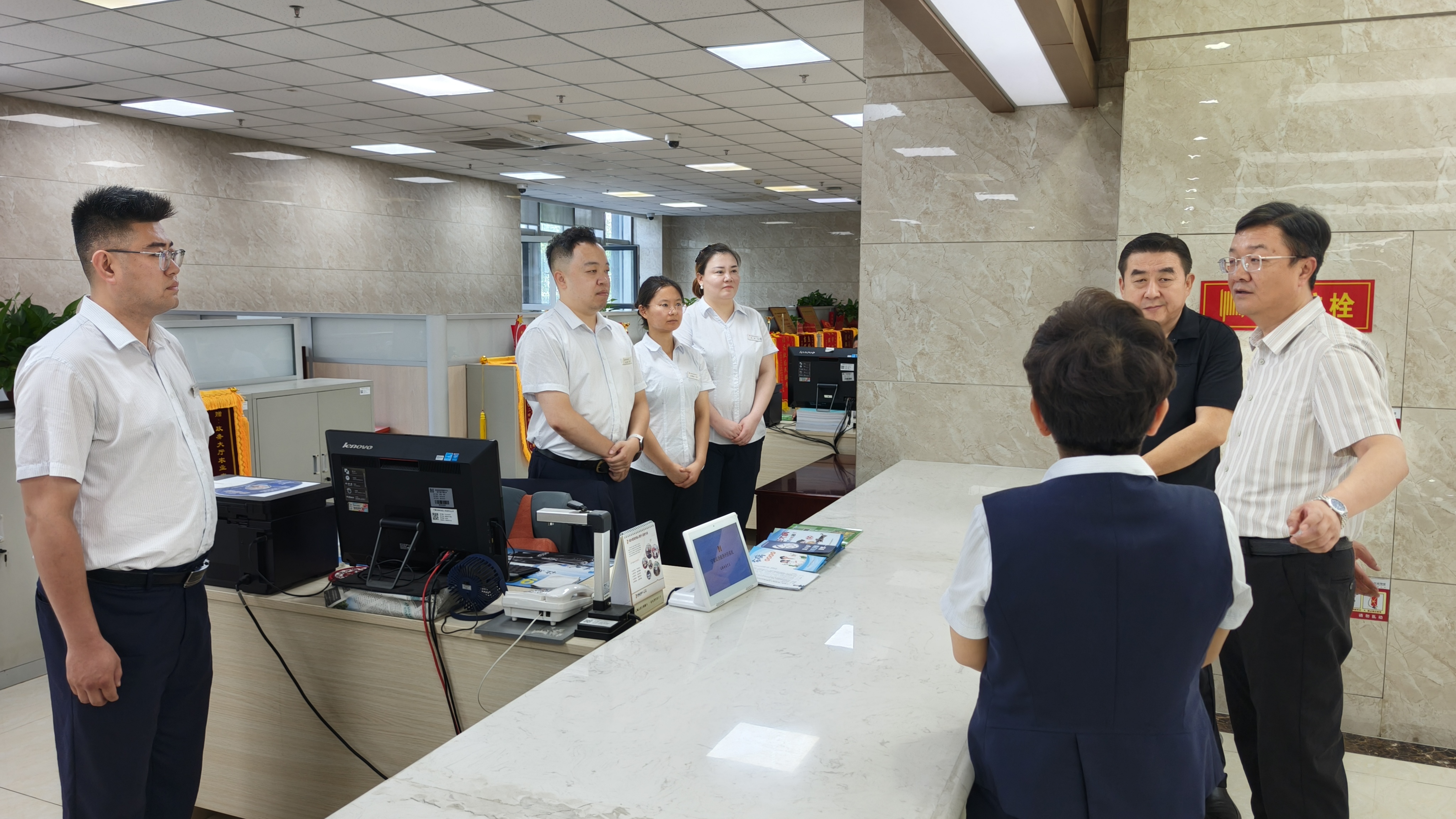 王静戟一行现场听取了窗口首席代表关于上半年农业农村厅行政审批服务工作情况汇报,查阅业务资料,并与窗口工作人员交谈,了解业务办理情况、高频事项办理及群众满意度等情况。在调研中,王静戟、骆永文同志对窗口人员的工作给予充分肯定。王静戟同志对自治区政府办公厅长期以来对农业农村厅窗口工作的支持表示感谢。